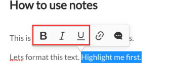 - To format text in your note, highlight the text and right-click to bring up the menu. Select the options you want in the menu (bold or italics) or use the keyboard shortcuts - control/command +B for bold, and control/command +I for italics.