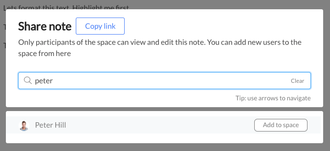 - Get a shareable link to your note by clicking on the "Invite users" icon in the top right-hand corner of your page. Please be aware that recipients must be a member of your Workast team to view the note, and if the note is created in a private space, only members of that space will be able to view the note.