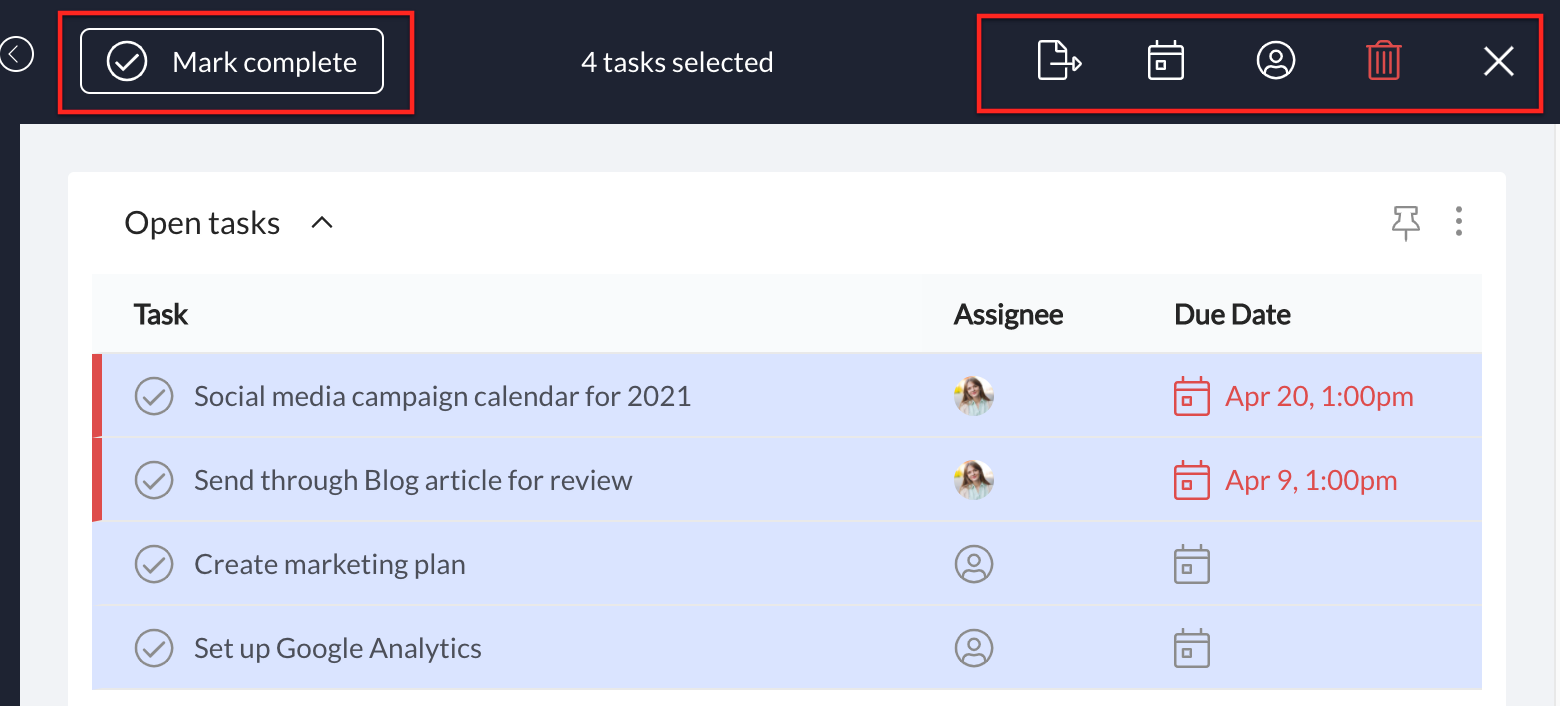 Once multiple tasks are selected, a toolbar will appear at the top with the following actions: